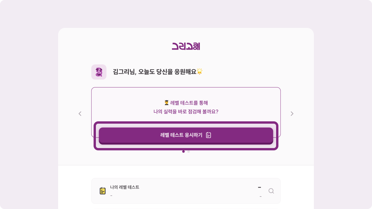 홈 화면의 '레벨 테스트 응시하기' 버튼을 눌러 테스트를 진행해 주세요.