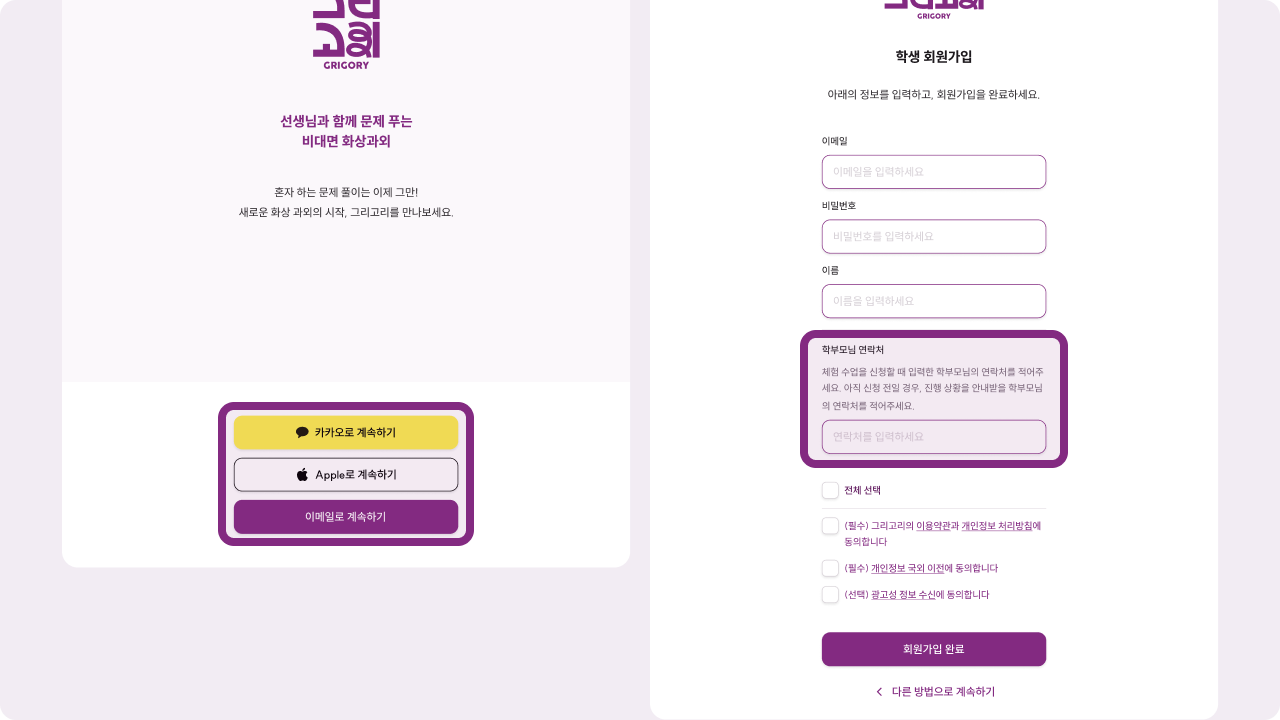 회원 가입 화면에서 신청했던 학부모님의 번호를 입력하고, 가입을 완료해 주세요.