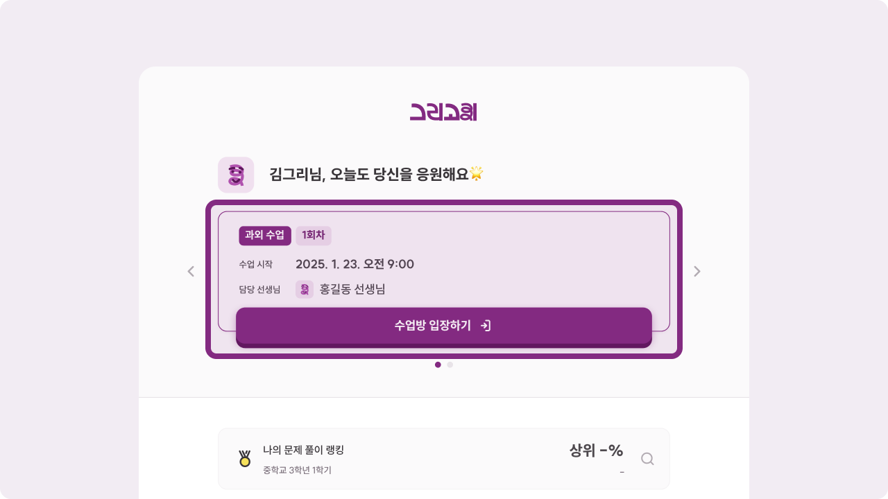 최초 상담을 통해 첫 수업 스케줄링이 완료되었다면, 그리고리 앱 내에서 예정된 수업을 확인할 수 있습니다.