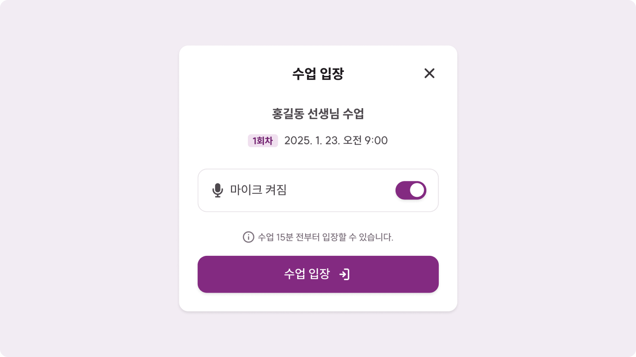 수업방에는 15분 전부터 입장할 수 있습니다. 수업 진행을 위해 마이크 권한을 허용하고, 수업방에 입장해 주세요.