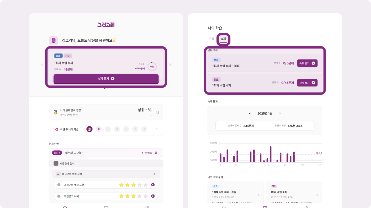 기존에 풀었거나, 선생님과 함께 풀었던 문제를 다시 점검하는 복습 숙제와 이후 진도를 나가기위해 풀게 되는 진도 숙제가 있어요. 두 유형 모두 동일하게 앱 내에서 풀기만 하면 끝이랍니다.