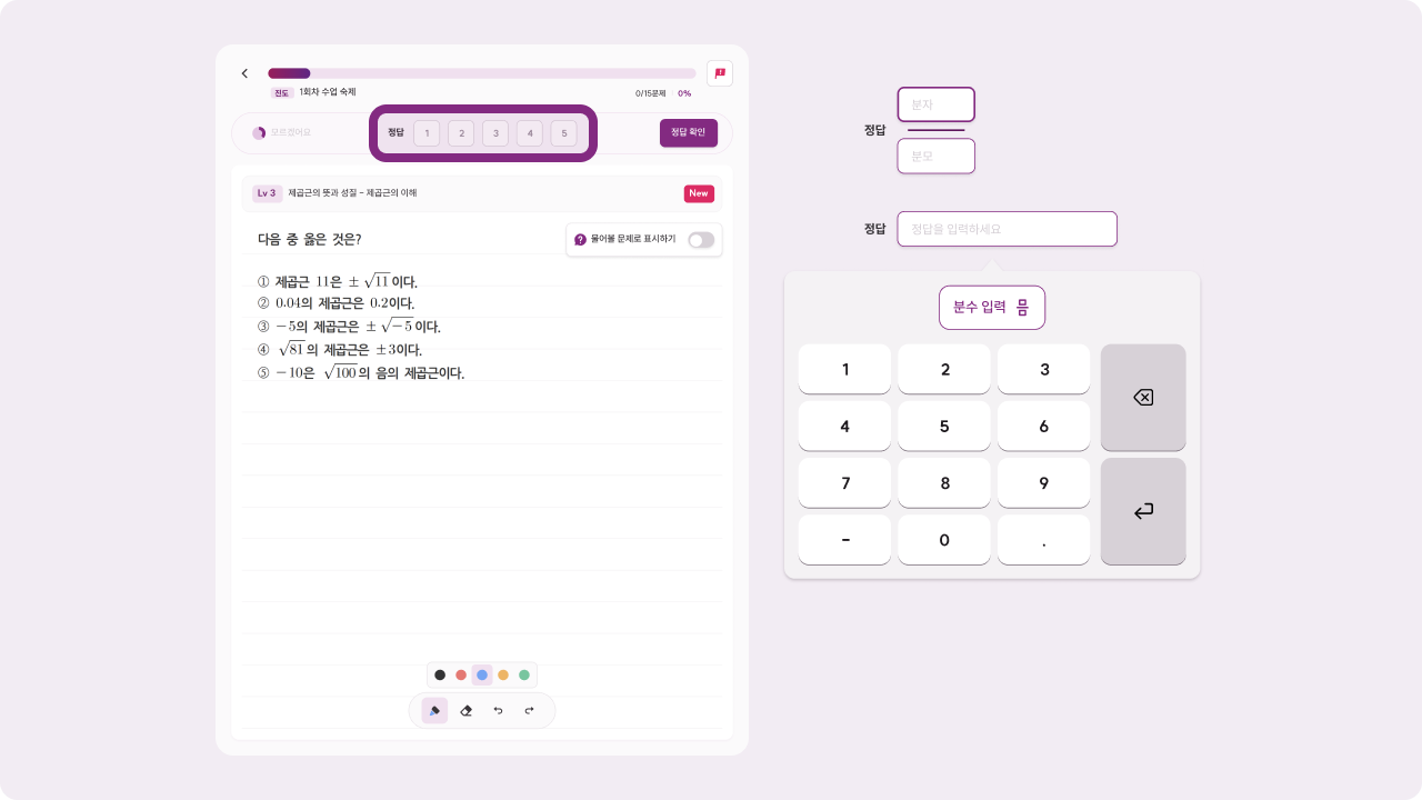 수업과 동일하게 필기하면서 문제를 풀 수 있고, 상단에 보이는 선택지를 눌러 정답을 체크해 보세요.