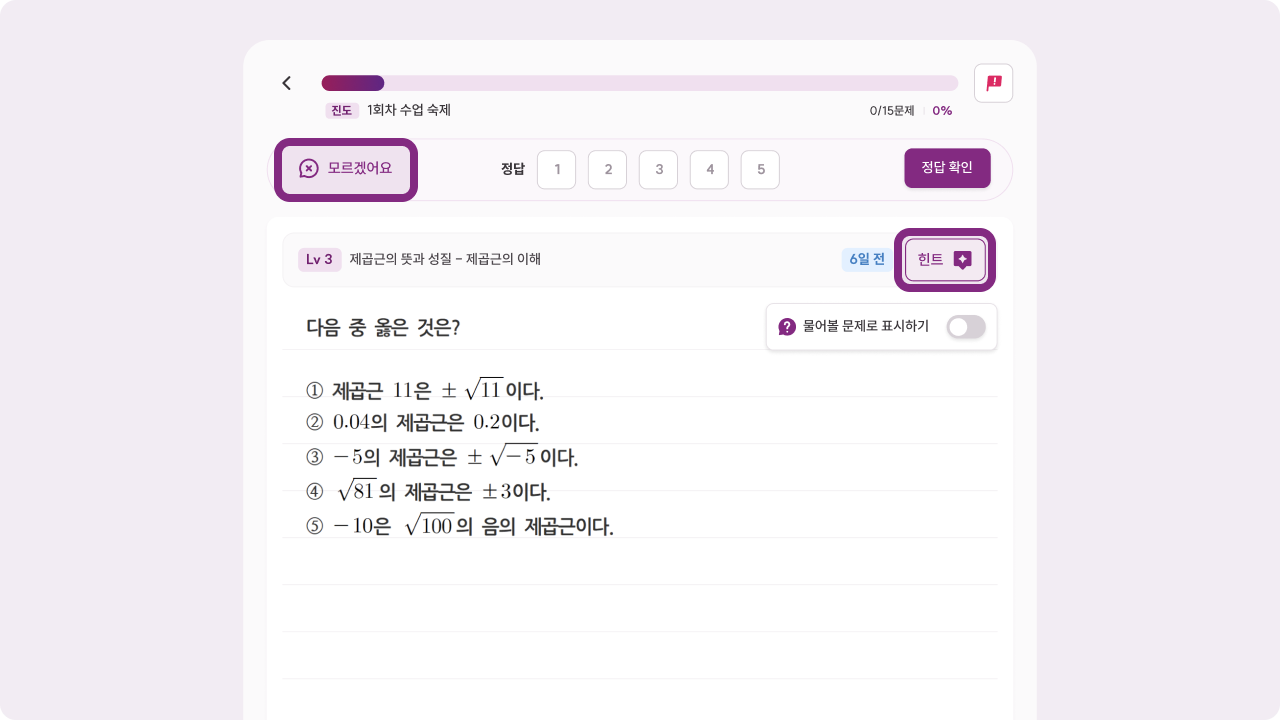 '모르겠어요'를 선택하면 이 문제는 오답으로 처리되고, 다음 문제로 바로 넘어가요.